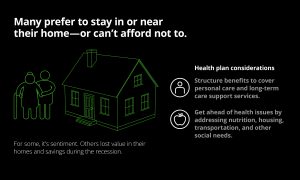 Although areas of the country that were not previous retirement destinations have seen a growth in their older adult population, many older adults are also staying in their current communities—or even their current homes—as they age.[3] (See figure below.) Health plans also may be looking for ways to help their members age in place as the demand for that arrangement rises. CBOs’ programs and solutions can complement health plans’ in-home services (like remote-monitoring solutions). This trend may also mean that CBOs will need to add new positions or staff to develop new programs to respond to the needs of plans and MA requirements.