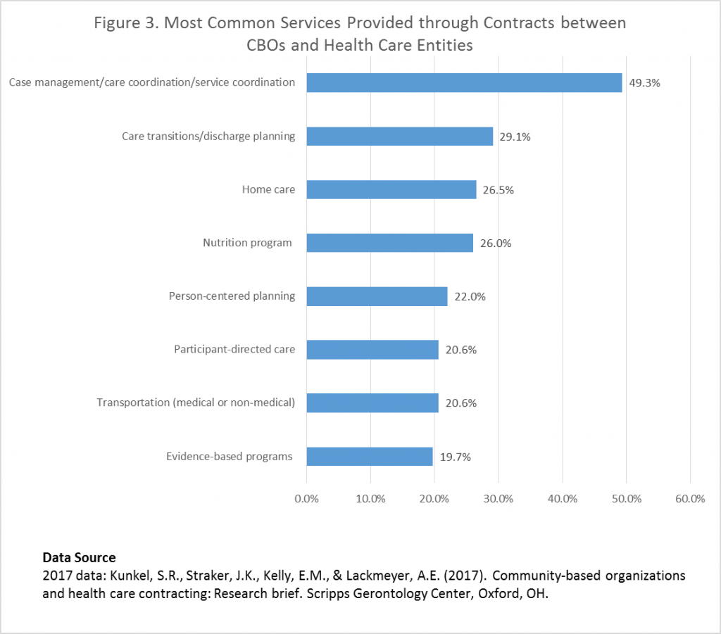 Source: Kunkel SR, Straker JK, Kelly EM, Lackmeyer AE. Community-based organizations and health care contracting: research brief. Oxford (OH): Scripps Gerontology Center; 2017 Dec.